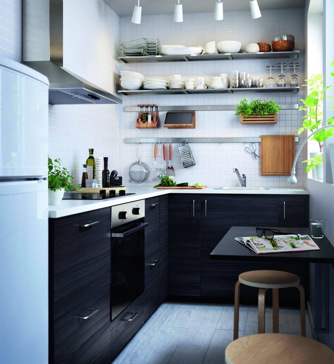 Потолочные светильники можно также повесить, выделив пару зон кухни, но важно не располагать их в линию, чтобы не усилить «туннельный» вид кухни.