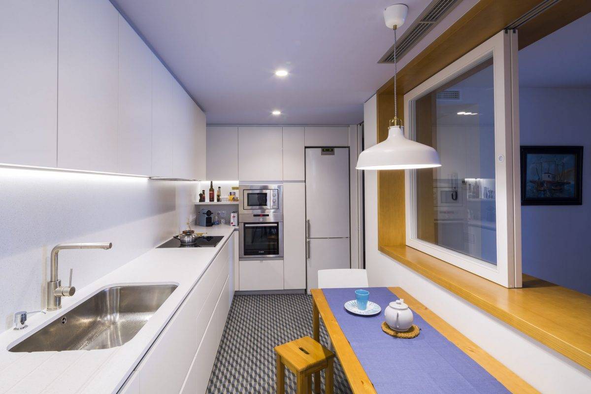 Если в конце длинной кухни расположился балкон — не стоит его к ней присоединять. Этим ещё больше увеличивается её длина. А вот освещённость при этом может быть хуже. Конечно, если балкон расположен отдельно и имеет свободные боковые стенки, при остеклении он превращается в подобие эркера и увеличит поток света при закрытых окнах. Но если это лоджия, то остекление, наоборот, уменьшит поток света, который будет доходить до дальней стороны кухни.