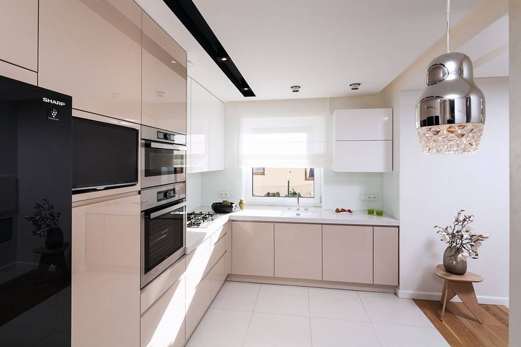 - Лучше использовать встроенную систему бытовой техники. Духовой шкаф разместить под варочной панелью, холодильник убрать в шкаф-пенал, посудомоечную и стиральную машины разместить в нижних шкафах в районе мойки.