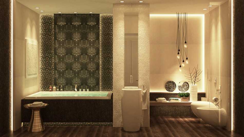 Возможность использования приглушенного света выгодна при оформлении дизайна ванны с туалетом. Так появляется возможность расслабиться, не обращая внимания на стоящий рядом унитаз.