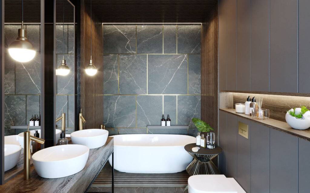 - Просторный санузел. В большой ванной, в отличие от маленькой, достаточно места, чтобы разместить большую зону хранения, отдельностоящую чашу, двойную раковину, биде и другую модную сантехнику.