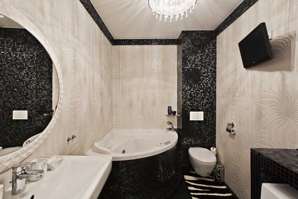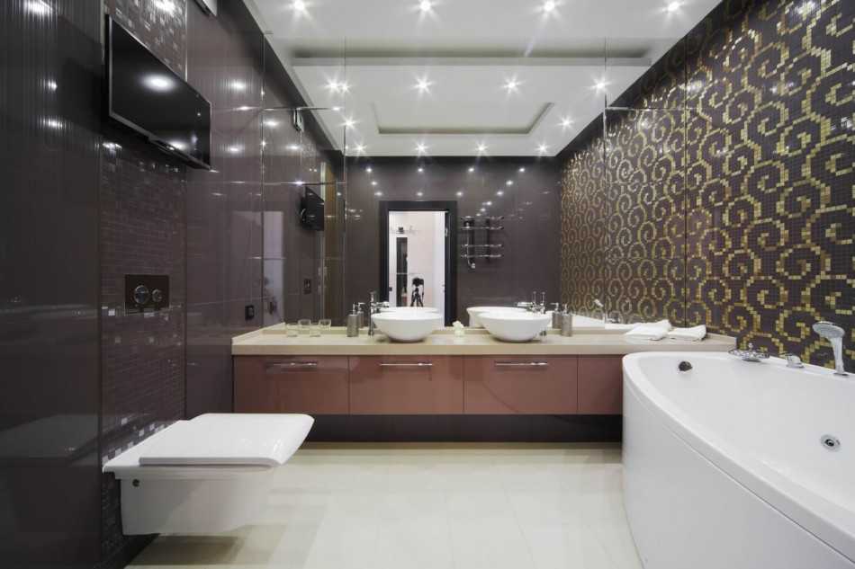 Фото новинок дизайна ванной комнаты в сети показывают о преобладании спокойных светлых тонов. Темные оттенки могут использоваться в качестве элемента зонирования помещения: когда в квартире-студии выделяется пространство для ванного уголка.