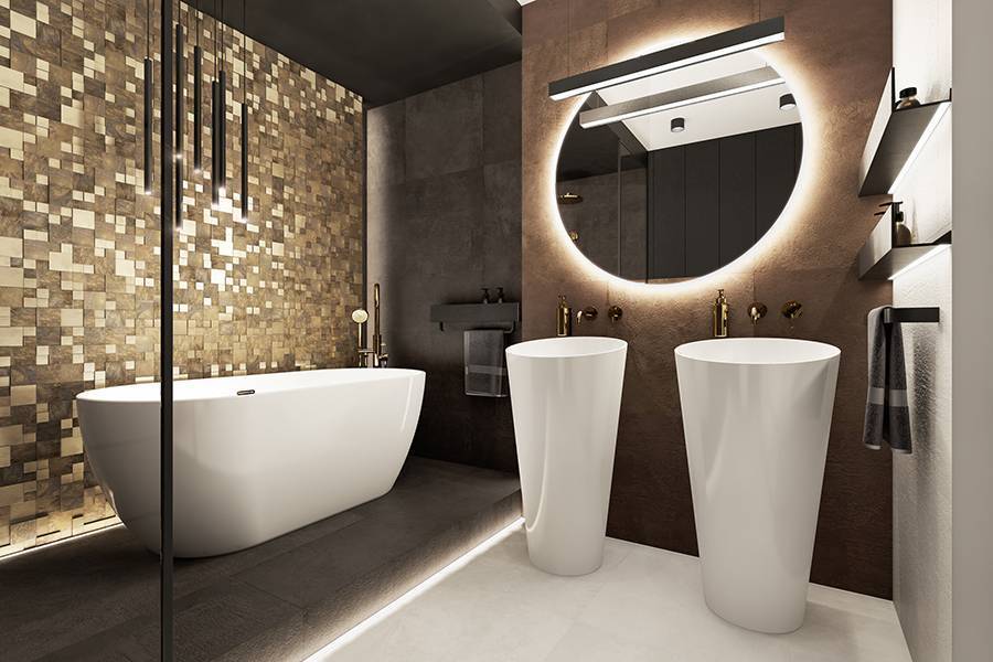 Освещение помещения по зонам позволит улучшить его внешний вид и сэкономить на электричестве. В зависимости от потребностей, человеку требуются разные источники света. Утром и вечером достаточно двух бра у умывальника. Во время принятия ванны можно ограничиться подсветкой в стене.