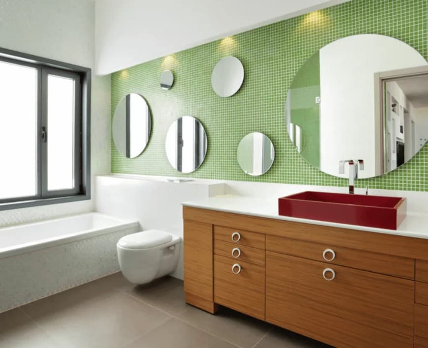 Идея стильной ванной комнаты: ярко, сочно. Изюминку здесь создают круглые зеркала.