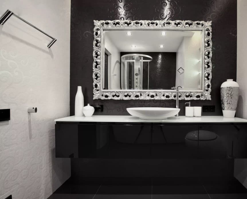Черно-белое оформление, зеркала – это очень необычно. Мало кто решается на столь мощный контраст. Зато это неповторимый стиль – ванная, не как у всех.