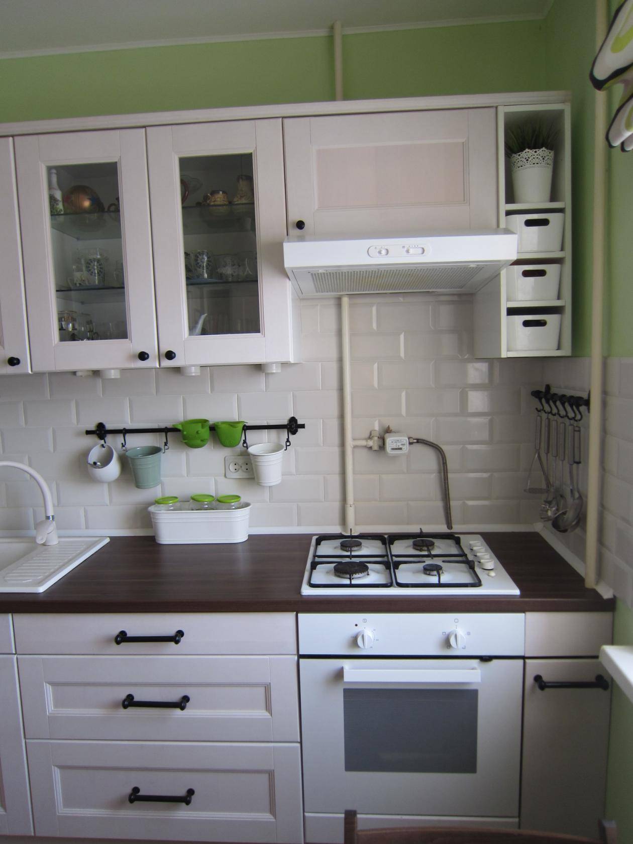 - Визуальное увеличение помещения (особенно при использовании светлых оттенков). Кроме того, фисташковый не «крадёт» свет. Поэтому он подходит в качестве основного цвета для отделки малогабаритных или плохо освещаемых кухонь, выходящих окнами на север или запад.