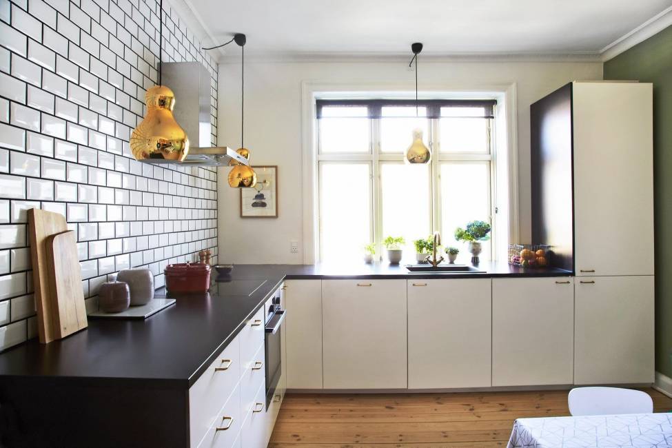 Минимум лишних предметов, акцент на прямых линиях, просторе и свете — это то, что нужно для небольшого помещения. Подбери светлые кухонные шкафчики и тумбы, отдай предпочтение встроенной технике, а обеденную зону перенеси в другую комнату. Кстати, подоконник можно трансформировать в столешницу — здесь можно и готовить, и перекусить.