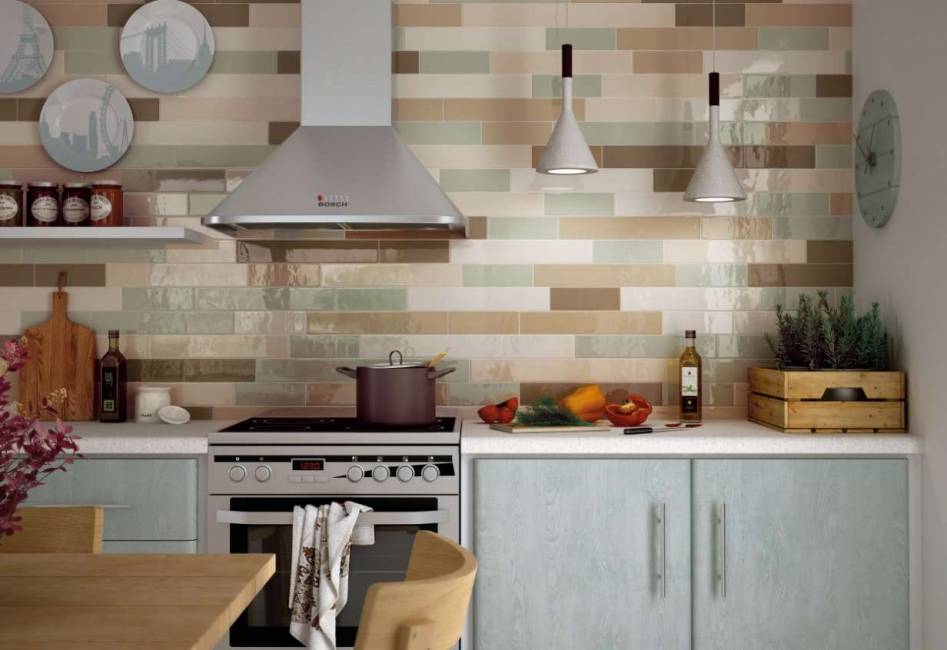 Плитка кабанчик не диссонирует с кафелем другого типа, в частности, при разграничении рабочей зоны и смежных с ней. Эстетическое восприятие кабанчика только выиграет, при наличии мозаики, уложенной в виде полосы, узорами в районе плиты, а также комбинациями различных оттенков и методов укладки.