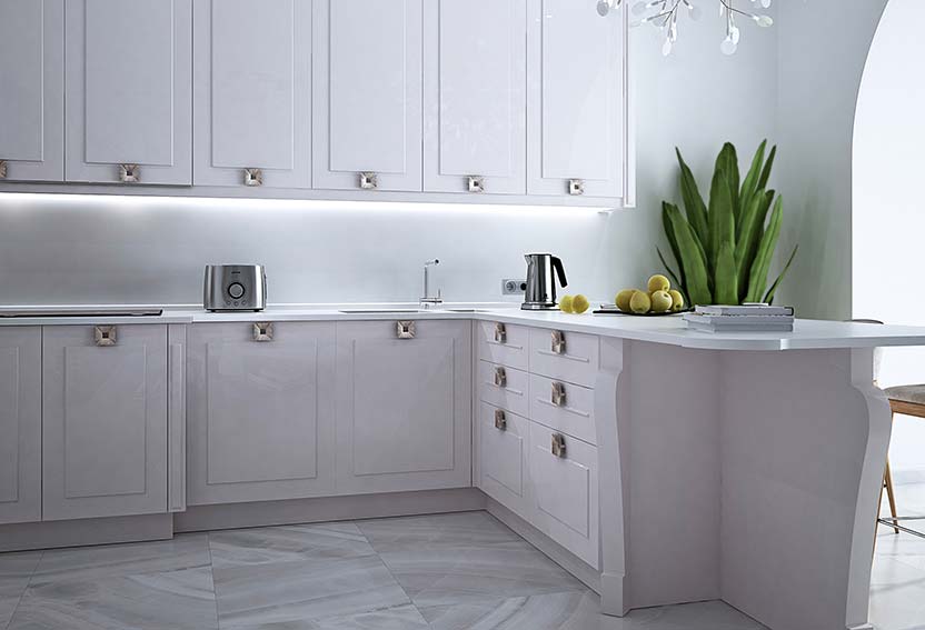 глухие — подходят для кухонь, выполненных в тех стилях, где гладкая ровная поверхность является ведущим элементом. Такие фасады не имеют стыков или зазоров, изготавливаются из различных видов дерева (акация, сосна, дуб, ольха, дуб, бук), ДСП, МДФ (окутанный пластиком или пвх-пленкой, фанерованный натуральным камнем или крашеный);