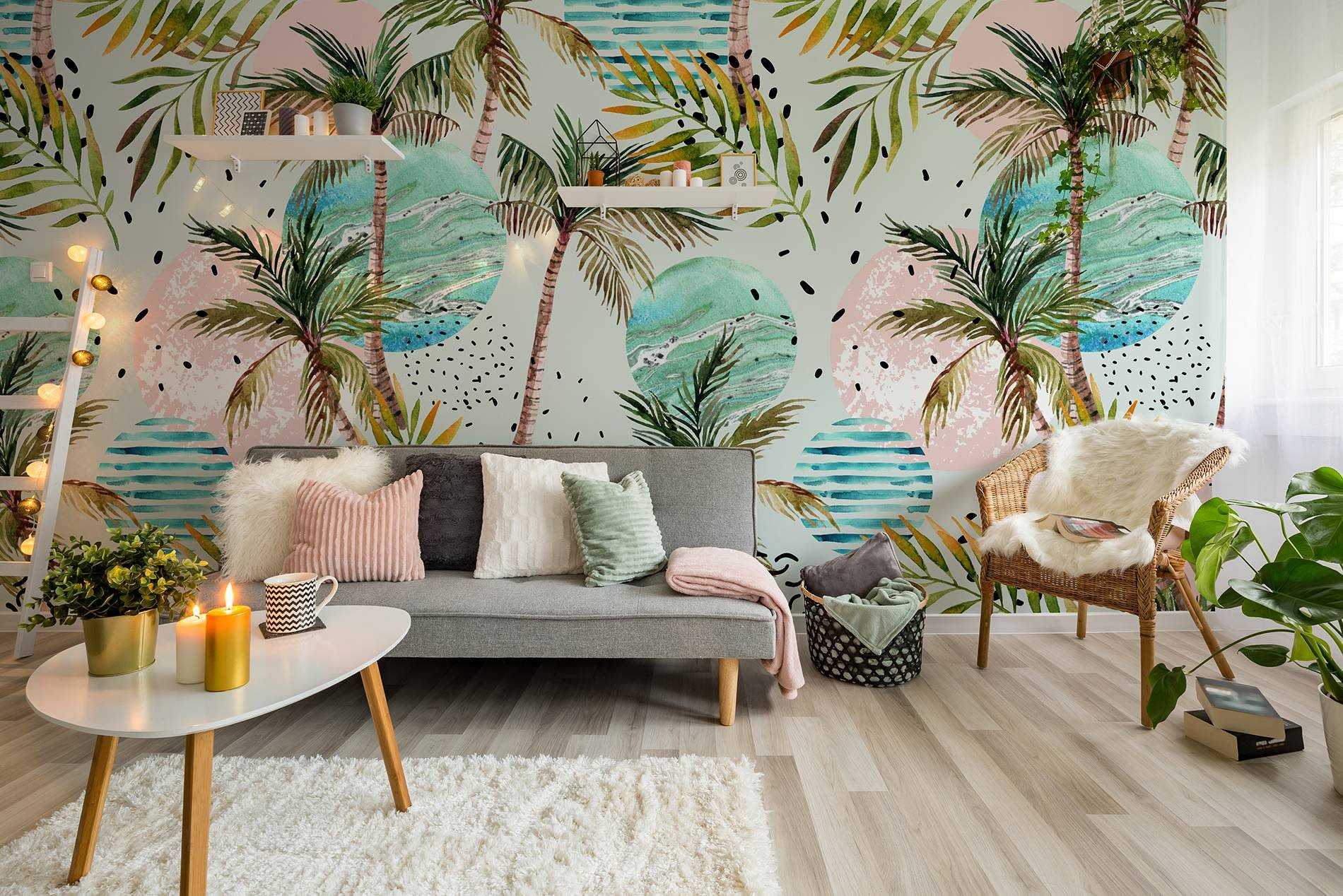 Модной темой этого сезона для современных обоев в гостиную на 2022 год являются тропики. Пальмовые листья, ананасы, фламинго и туканы часто появляются на стенах. Обои с таким декором оживляют интерьер и способствуют расслаблению на диване.