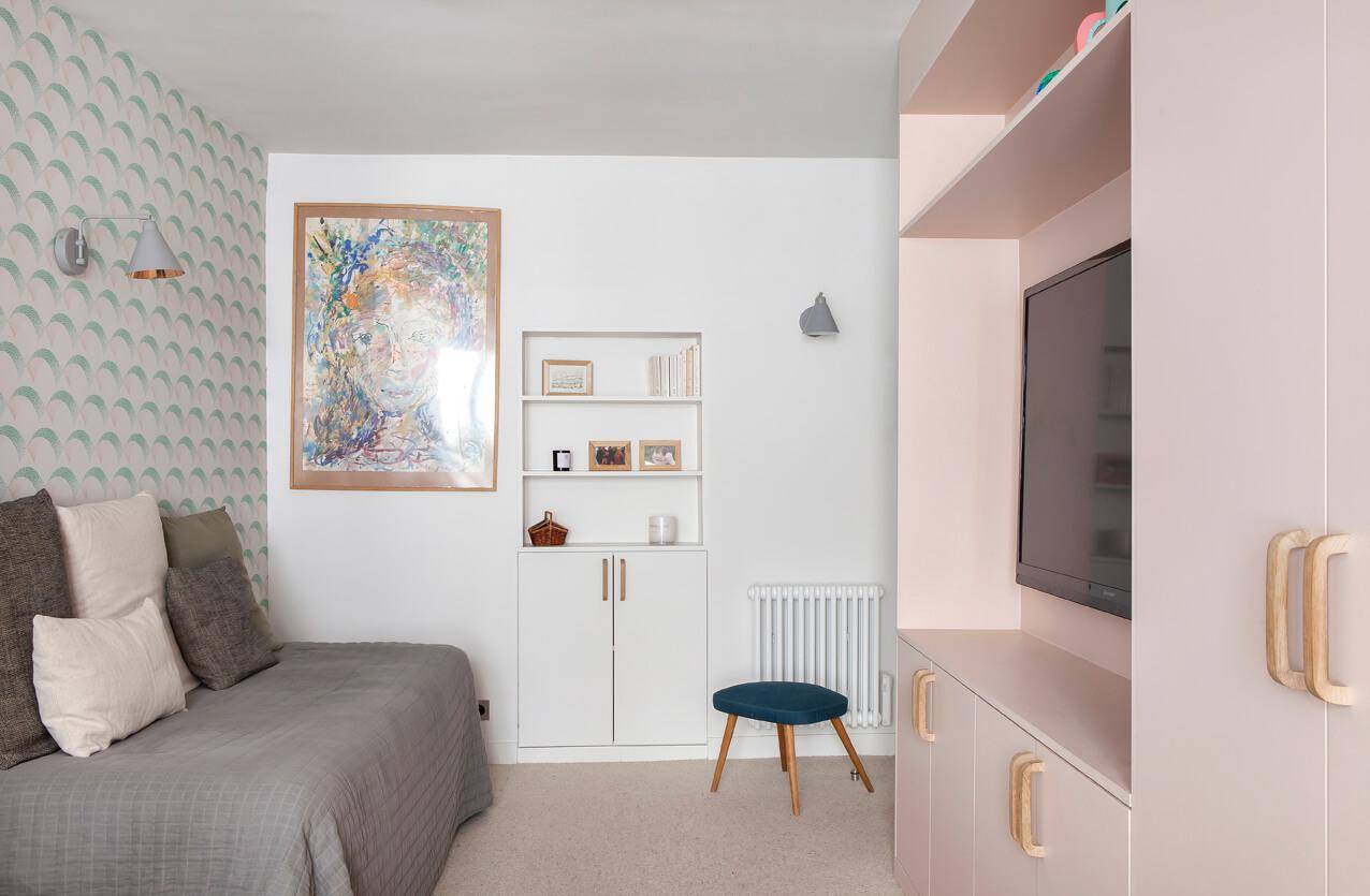 Потайная гардеробнаяЕсли комната вытянута в форме пенала, еще более практично обустроить гардеробную за изголовьем кровати. Такие варианты разделения пространства идеально подходят и в том случае, когда требуется перепланировка однокомнатной квартиры для семьи с ребенком. В отдельном уголке можно оборудовать полноценную детскую. Однако обустройство перегородок — не единственное возможное решение для зонирования пространства.