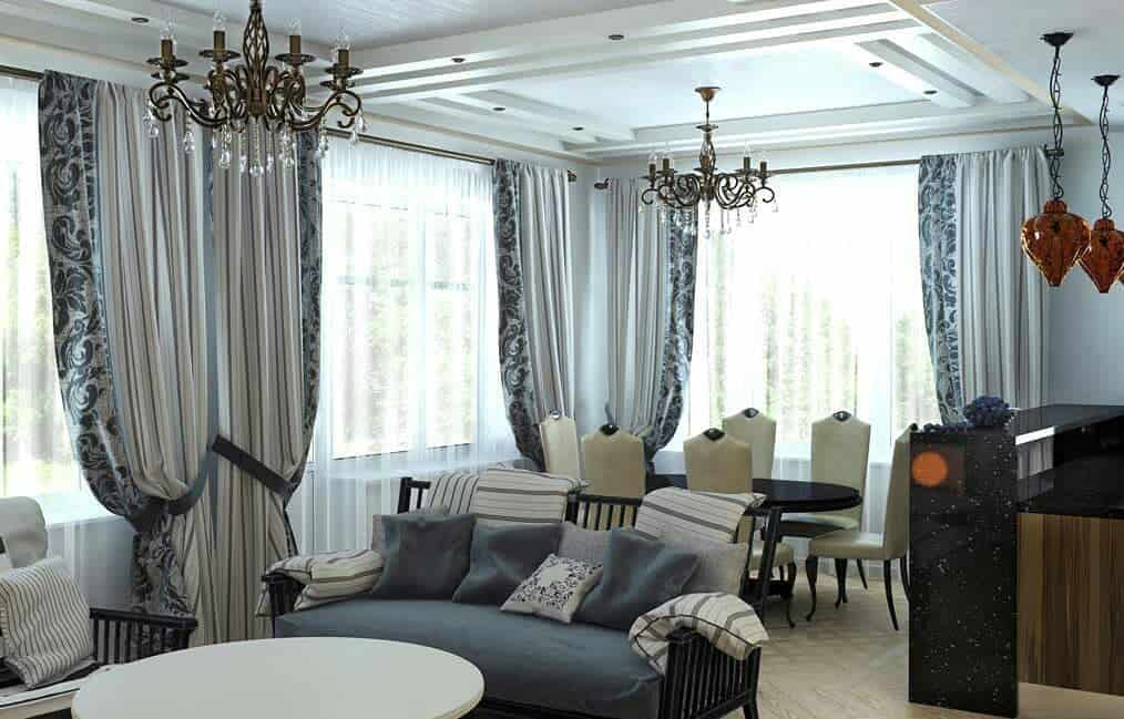 В последние годы наблюдается тенденция влияния минимализма на различные стилевые направления. Поэтому даже традиционный дизайн стал более аскетичным. Шторы из льна, хлопка и других подобных материалов используются в классическом варианте, с драпировками и защипами.