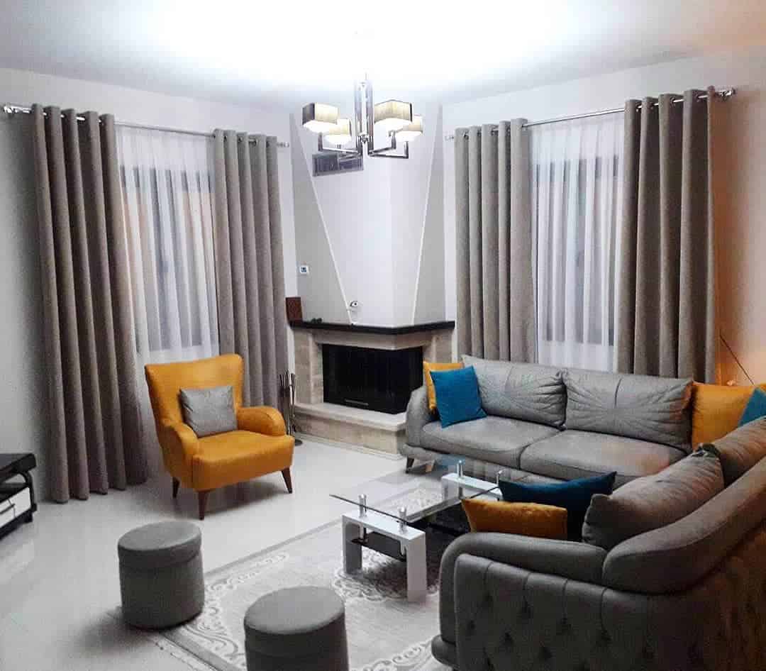 - Если же в комнате стоит диван, обитый в горчичную ткань, то он должен быть в гостиной в центре внимания. Стены покрываются обоями темного цвета. Для равновесия гармоничного восприятия интерьера можно использовать на окнах шторы в горчичном. В гостиной с мебелью желтого цвета полы покрывают светлым деревом.