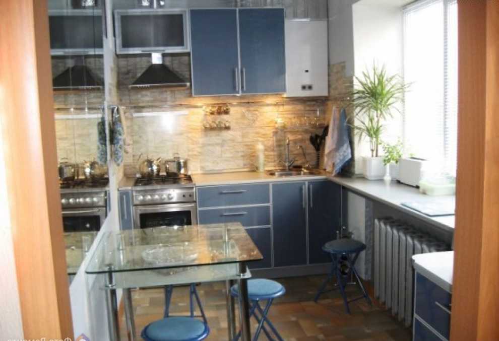 Еще один вариант — купить стеклянный стол. Такая мебель даже на крохотной кухне отлично смотрится. Стекло используют закаленное, так что при аккуратном обращении с ним ничего не станется. Еще один дизайнерский прием позволяющий раздвинуть границы помещения и поиграть со светом — зеркальные поверхности. Это может быть кухонный фартук из зеркальной или металлизированной плитки, настоящее зеркало на стене (на фото ниже).