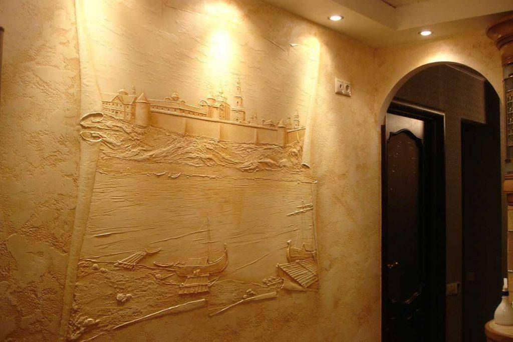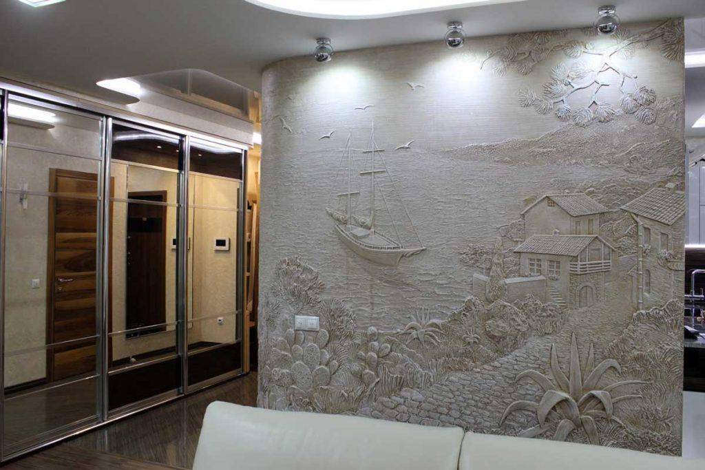 Декоративная штукатурка. Она позволяет скрыть дефекты стен и не утяжеляет пространство. Выигрышно выглядят природные виды на рельефной штукатурке.