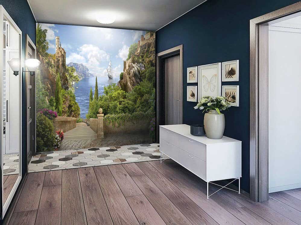 От отдельных макроизображений предметов лучше отказаться. Обыграть помещение можно с помощью 3D-рисунков. Они придают масштабность узкому коридору.