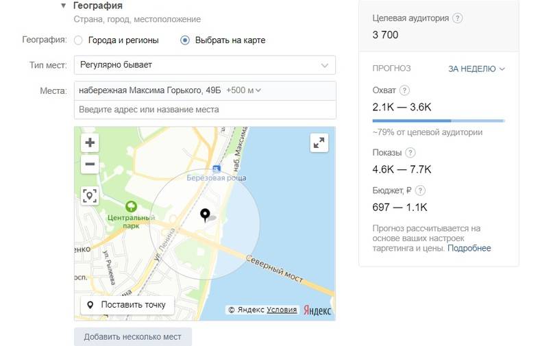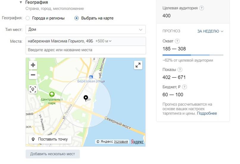 В случае с домом на набережной лучше выбрать настройку «Дом», поскольку рядом активный пассажиропоток и возможны нецелевые показы при выборе «Работы».
