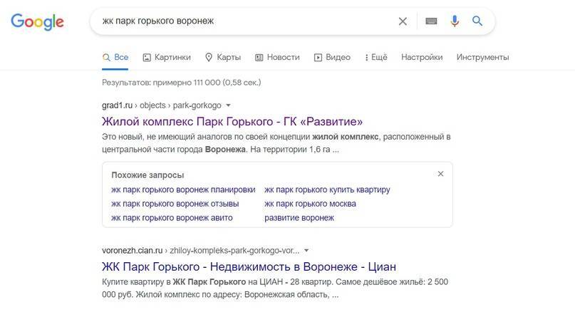 Метод похож на предыдущий, его отличие в том, что настраиваем таргетинг не на участников сообществ, а на географическую область, где расположен ЖК. Рассмотрим на примере ЖК «Парк Горького» из Воронежа.