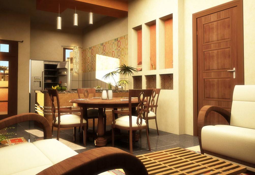 Для кухни дизайнеры рекомендуют выбирать фартук с фресками или нанесенным орнаментом в этническом стиле. Можно использовать массивные деревянные столешницы темного цвета, фасады с резными ручками, темный металл для вытяжки.