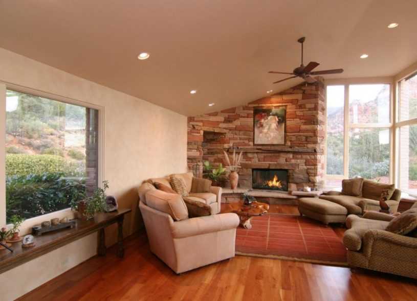 Помните! Чтобы симметричный угловой камин отлично смотрелся в комнате, он должен быть виден из любой точки помещения.