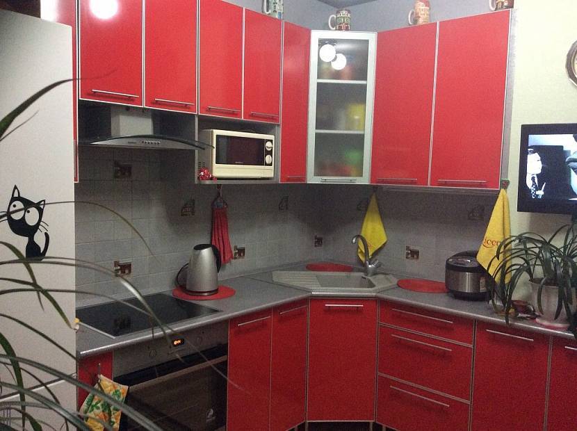 - Кухонным гарнитуром и стеной, особенно при сильном контрасте оттенков. Важна такая плита, когда облицовка уже поношена, при сильной затирке углов. В этом случае данная деталь служит для освежения интерьера. После ее установки может показаться, что кухня стала ярче и эффектнее.