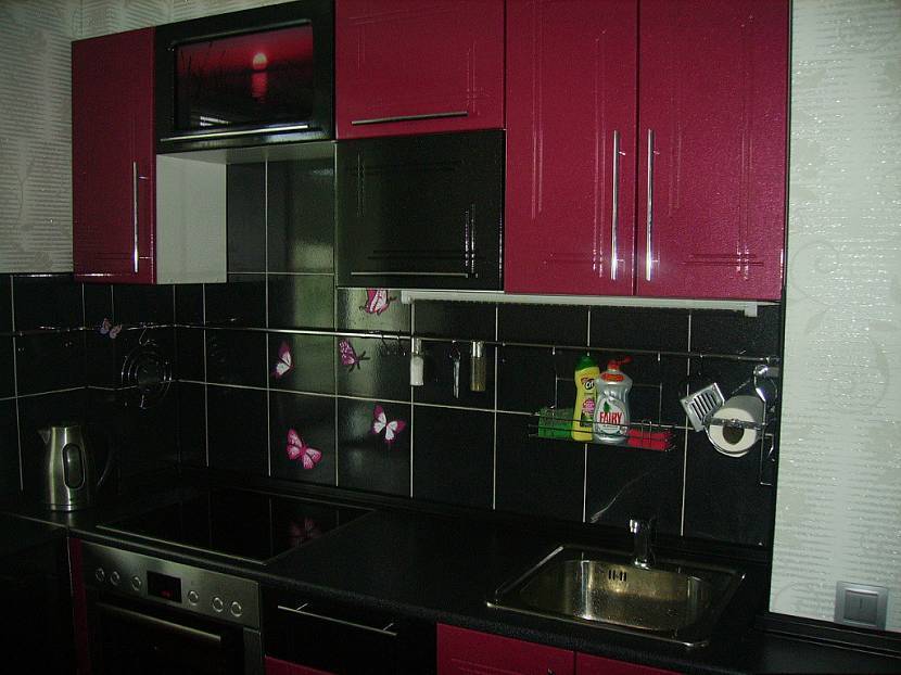 Кухонный фартук из черной плитки хорошо вольется в интерьер просторной кухни. Миниатюрное помещение он может сузить еще больше. Материал смотрится элегантно и стильно, при этом гораздо реже нуждается в мытье.