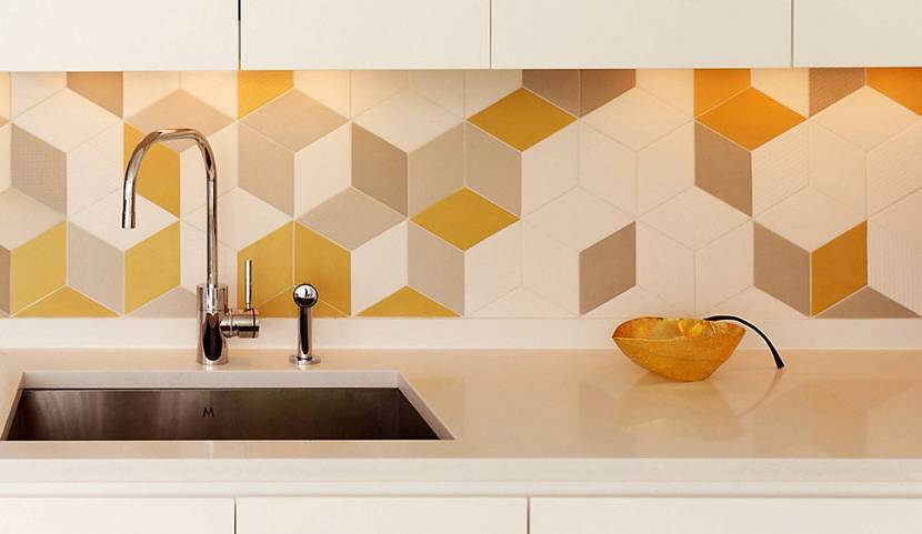 Еще один способ оформить рабочую зону – приобрести два оттенка плитки геометрической формы. Можно расположить треугольные фрагменты хаотично или в определенной последовательности.