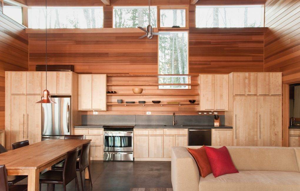 Эффектный экологически чистый материал с длительным сроком службы и возможностью реставрации. Однако при установке на кухне потребуется специальная обработка, так как древесина под действием влажности и перепадов температуры разбухает, трескается, деформируется. Обычно для этого используют воск. Если же панели покрыть лаком, потеряется естественная красота материала.