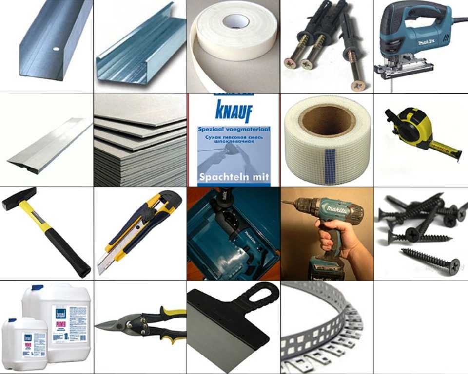 Для монтажа фальш стены из гипсокартона необходимо иметь следующие материалы и инструменты: