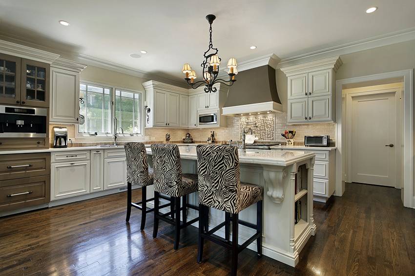 Если площадь кухни более 13 м2, дизайнеры советуют обратить внимание именно на этот тип расстановки. Он сделает помещение стильным и необычным