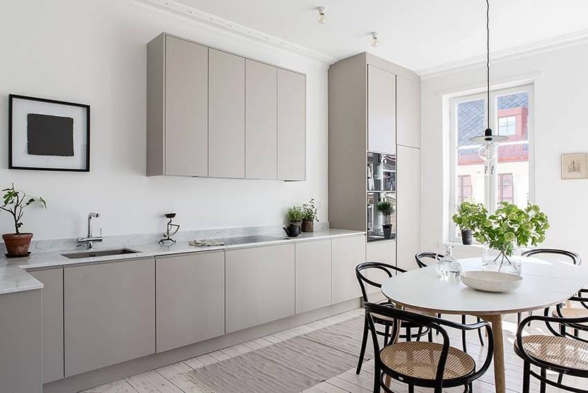 Этот прием идеально подойдет для кухни-гостиной, когда акцентировать внимание нужно на гостиной, а не на рабочем пространстве кухни. В этом случае отделать фартук лучше не плиткой, а, скажем, стеклянной панелью или покрасить стену в этой области специальной влагостойкой краской