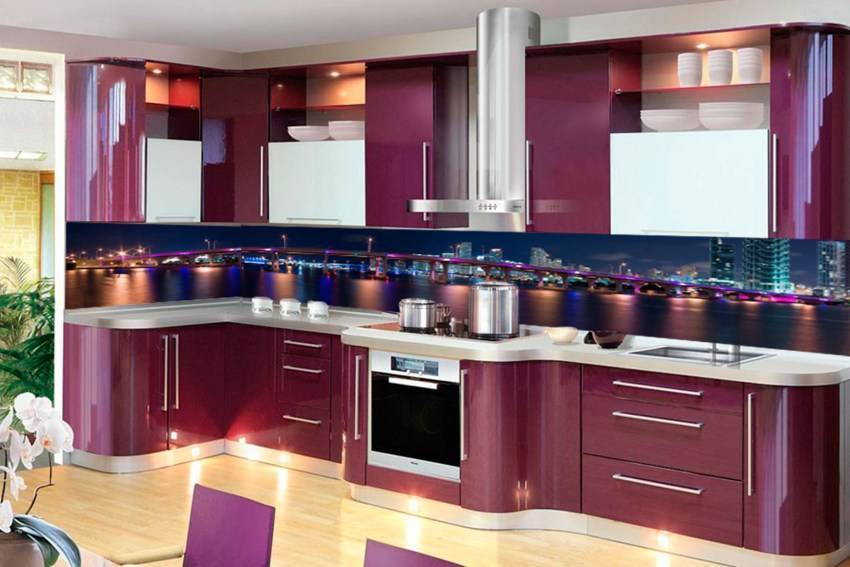 Стеклянный кухонный фартук как никакой другой сочетается с любой подсветкой.