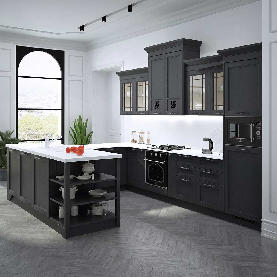 Тёмно-серая кухня с классическим белым потолком