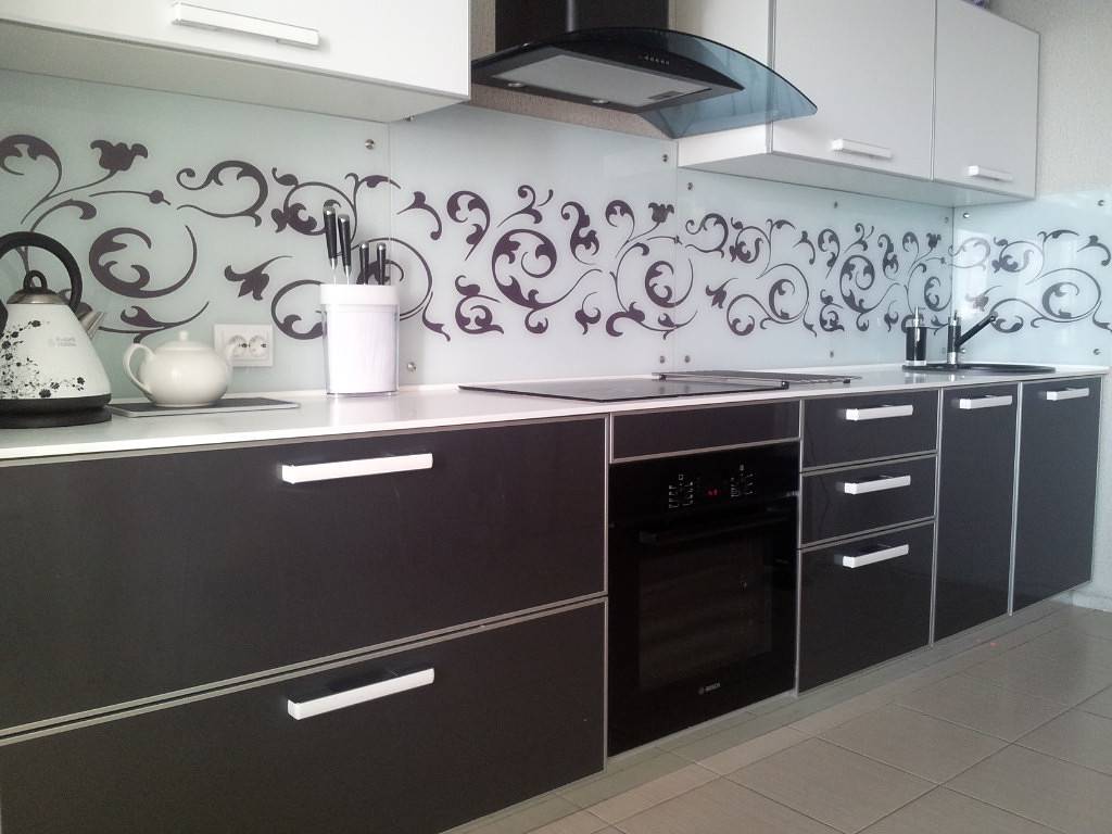Не менее оригинально будут выглядеть гарнитуры с фасадами, на стекла которых нанесена узорная фотопечать на прозрачном фоне с последующим перекрытием этого фона эмалью. Узорные бесшовные рисунки печатаются в любом нужном Вам цвете и перекрываются любым контрастным декором эмали, который можно выбрать из нашей складской программы, систем RAL, NCS, или любого другого международного цветового стандарта.