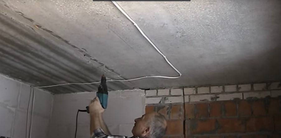 Потолок очищается от всего лишнего, снимаются светильники, провода изолируются. Если требуется, то устраивается новая разводка.