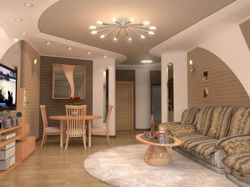 - Помещение можно разделить на функциональные зоны. Наличие нескольких уровней позволяет произвести зонирование. Примером такого решения может быть место в комнате с телевизором или журнальным столиком с креслом, кровать в спальне или стол на кухне.