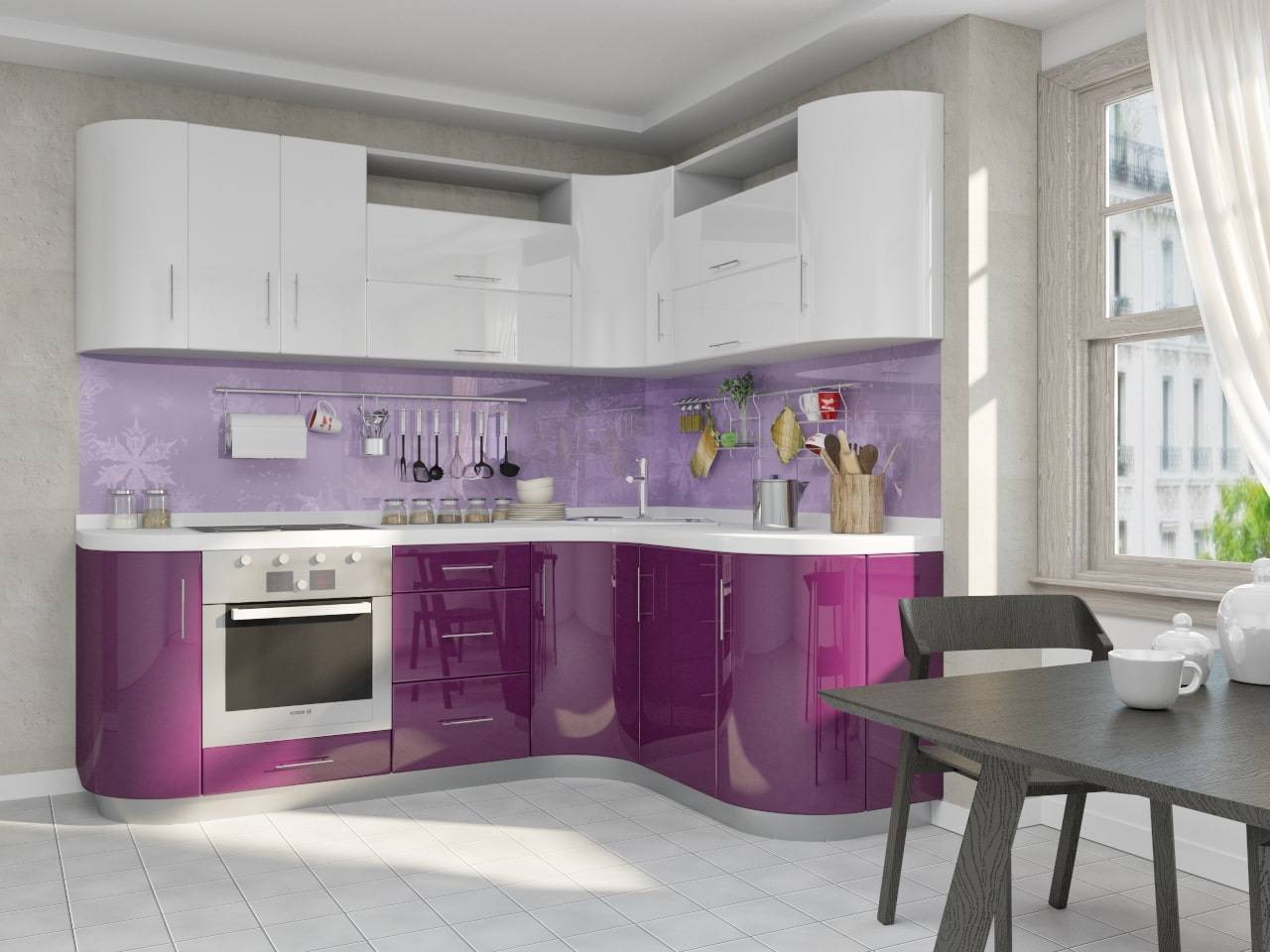Кухонный гарнитур должен иметь максимально лаконичное исполнение без вычурных элементов декора. Для обеденного стола, стульев, столешницы или фартука, уместна сиреневая или пурпурная цветовая гамма.