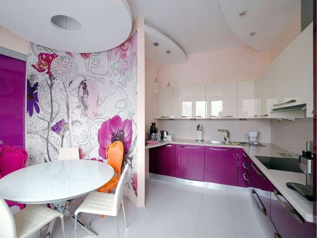 - Потолок. Фиолетовые кухни предусматривают выбор соответствующего вида и цвета для потолка. Наиболее удачным решением будет светлый тон. При большом разнообразии выбирают натяжные потолки. Обои в данном случае нежелательны, они будут смотреться очень дешево. Не рекомендуется и потолочная плитка.
