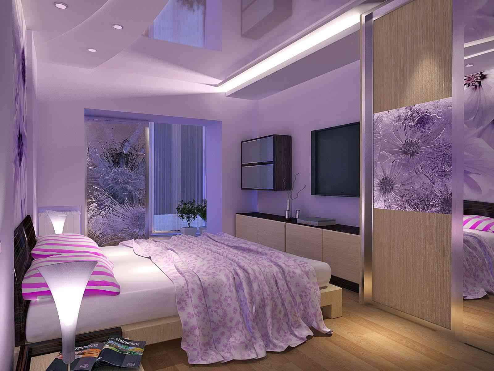 Дизайн спальни в сиреневых тонах создает атмосферу свежести, весеннего буйства природы. Данный оттенок зрительно расширяет небольшое помещение. Сиреневая спальня ассоциируется с пробуждением природы, чистотой и романтикой.