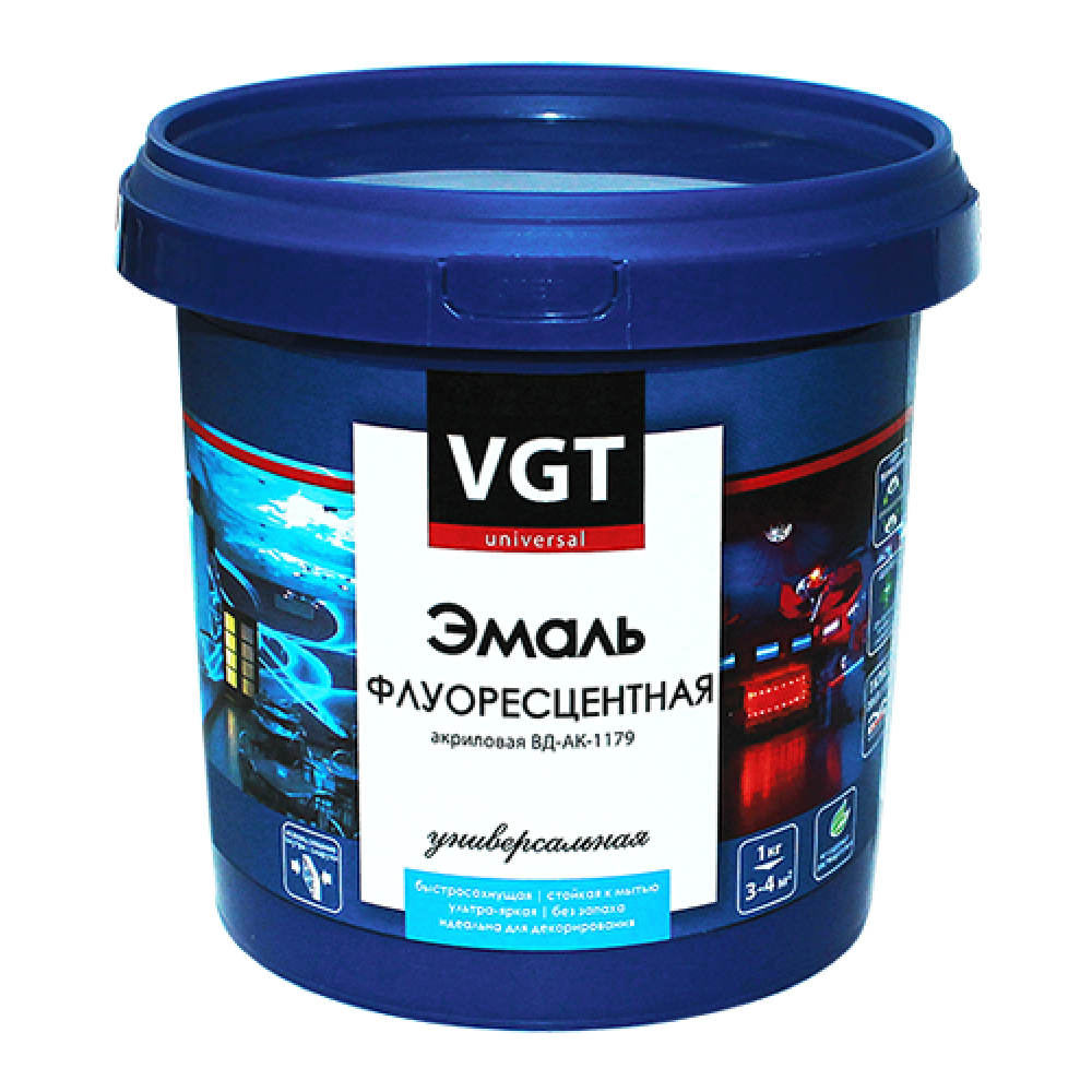 Флуоресцентная эмаль на акриловой основе. Используется для реализации дизайнерских решений внутри помещения. В нее добавляются пигментные частицы, которые светятся при попадании солнечных лучей. Они имеют разные цвета. Можно достичь любого другого оттенка, самостоятельно смешивая колера. Акриловыми пигментами очень хорошо окрашивать такие материалы, как гипсокартон, дерево, штукатурку. Покраска металла или пластика не рекомендуется.