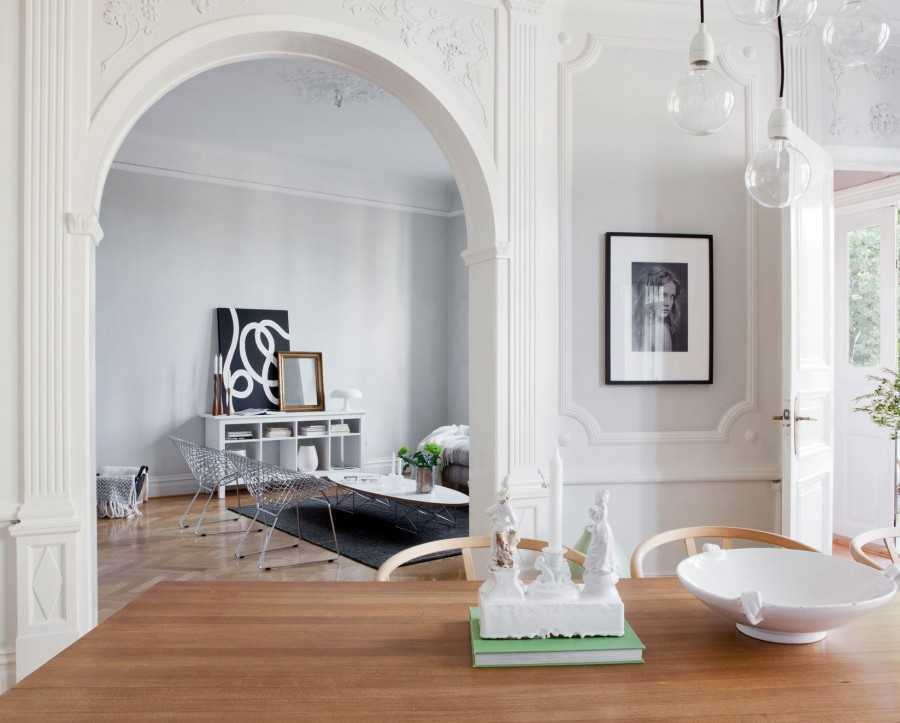 На фото арки в интерьере показан наиболее популярный способ оформления конструкции — это начальное оштукатуривание, затем покраска. Данный метод одинаково подойдёт как для применения в классическом роскошном, так и в супермодном современном стиле.