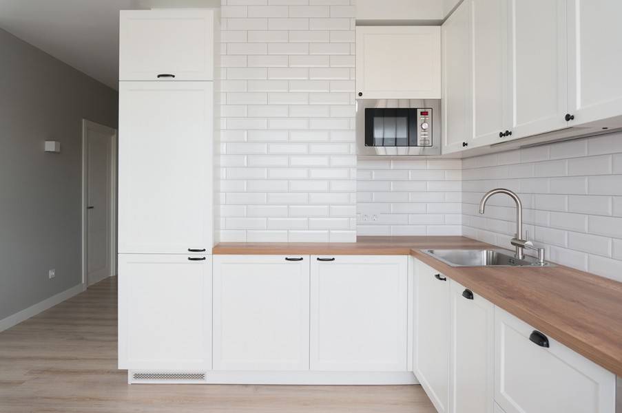 Для белой кухни без ручек идеально подходит постформинг. Он сглаживает прямые углы, создает более плавные и привлекательные линии. Еще один вариант кромки — алюминиевая. Она защищает от механических воздействий и повреждений, гармонирует с белым и его оттенками.