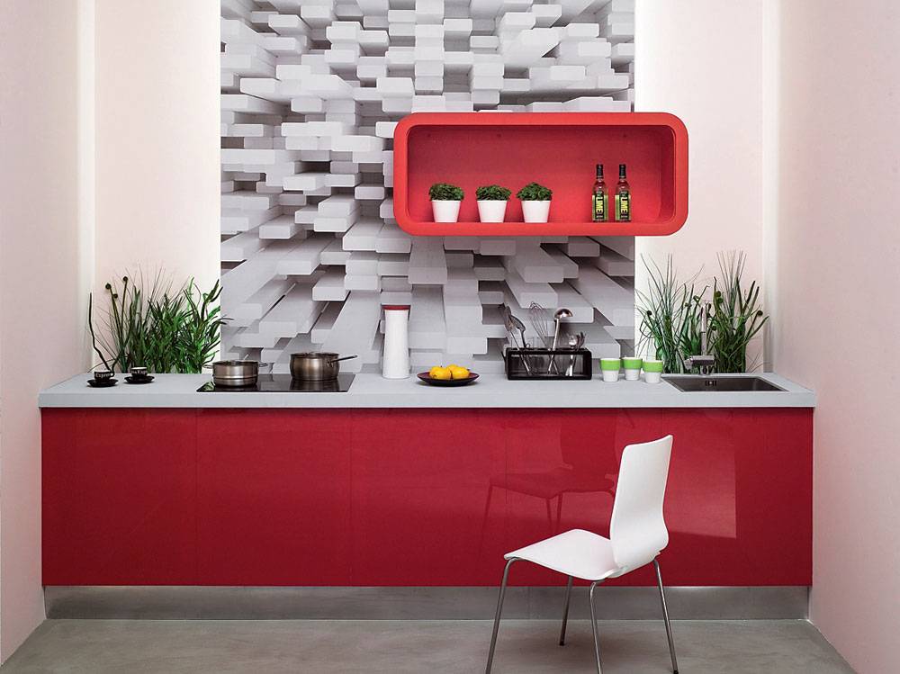 Фотообои являются не только красивой и интересной картинкой. Покрытие характеризуется массой полезных свойств. Правильно подобранный рисунок для кухни способен внести визуальные коррективы в интерьер помещения. Некоторые изображения создают настоящие оптические иллюзии, позволяющие зрительно расширить стены или приподнять потолок в комнате. Максимальный эффект достигается при заполнении обоями всей площади стены.
