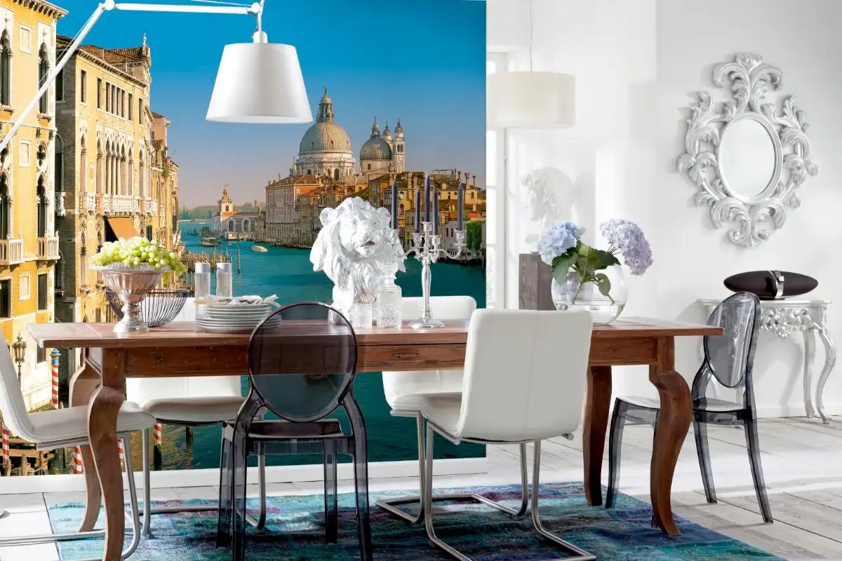 Стол и стулья очень хорошо смотрятся на выразительном фоне фотобоев. В поисках идей подойдут фотообои для столовой с геометрическими узорами или крупными цветами и другими цветочными мотивами. Фотообои с пейзажем или видом на город напомнят нам о наших любимых местах. За столом можно использовать обои любого типа.
