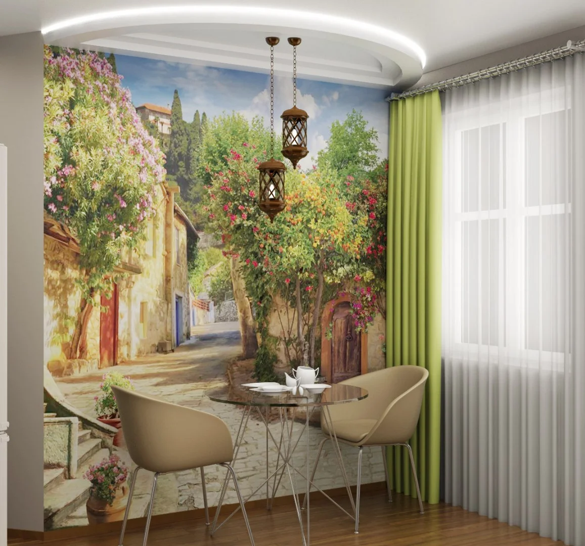 Многие клеят фотообои в зоне обеденного стола. Они способствуют созданию приятной атмосферы, располагающей к комфортному приему пищи. Орнаменты должны пробуждать аппетит. Предпочтение отдается натюрмортам, пейзажам в гастрономической тематике, цветочным композициям.