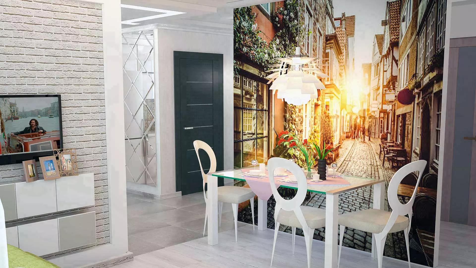 Зрительно увеличить комнату помогут фотообои, на которых изображено продолжение помещения. Это может быть широкий балкон, терраса или длинный коридор, распахнутое окно с видом на море, и так далее. В таком случае кухня сразу же приобретает более широкие границы.