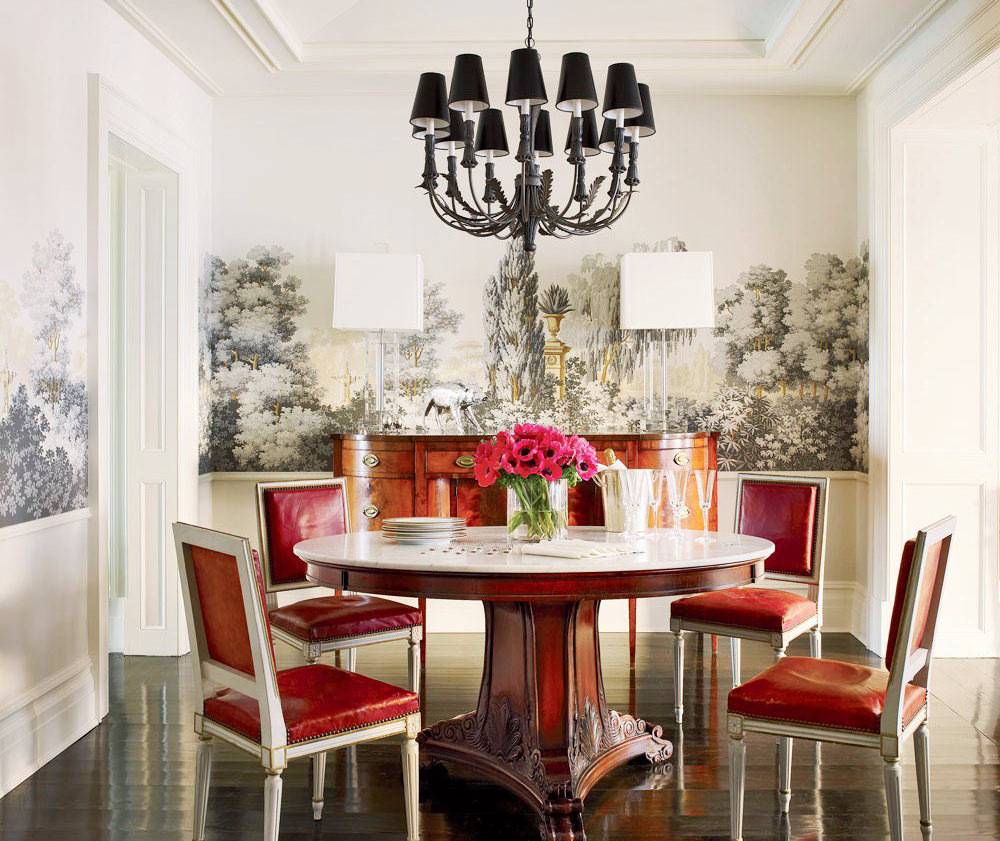 Если тебе нравятся дорогие текстильные обои с выраженной фактурой, золочеными нитями и украшениями – используй их как декоративные вставки в классической кухне. Главное, располагай композицию подальше от рабочей поверхности, плиты и мойки.