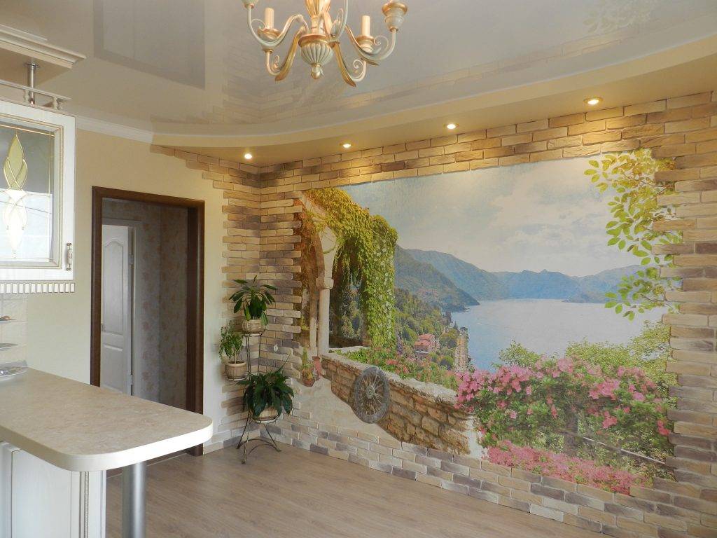 В спальных комнатах поверхности стен радуют взор городскими панорамами, в гостиных внимание приковывают пейзажи лазурного моря, а в кухне дизайнеры обычно применяют классический кафель, ассорти из овощей и фруктов