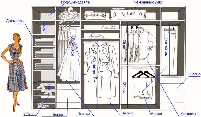 Перед тем как сделать заказ гардеробной по своим размерам, необходимо тщательно продумать все детали: на какое количество человек она будет рассчитана, сколько и какие вещи планируется в ней хранить. Для этого стоит произвести ревизию всех личных вещей. Это процедура понадобится, чтобы правильно определить необходимые элементы и аксессуары внутреннего наполнения гардеробной комнаты, а также способ их монтажа.