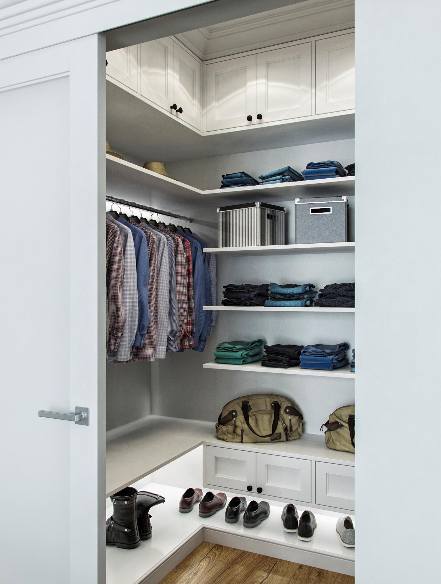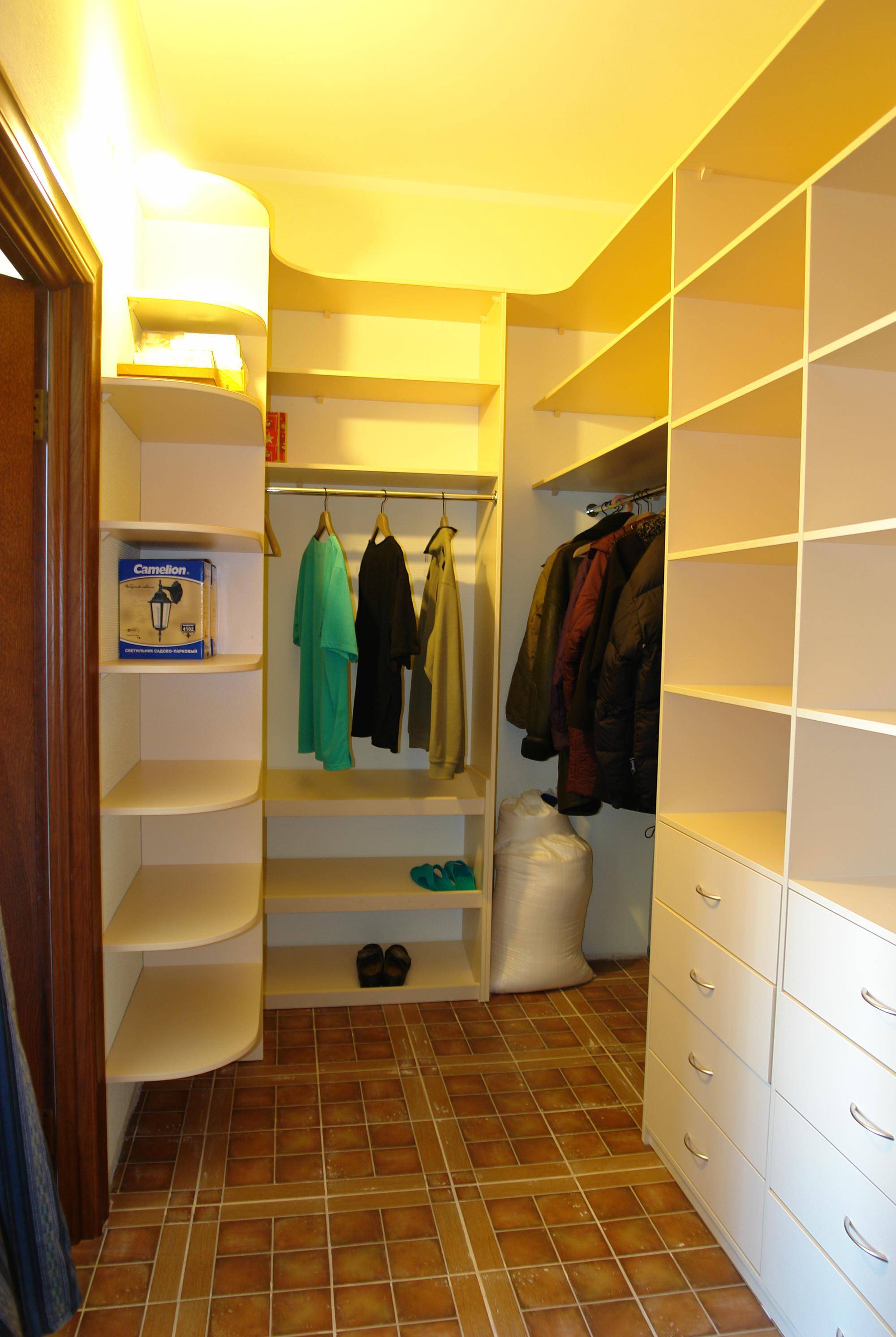 Системы хранения монтируются в угол. Вариант хорошо подходит, когда нужно сэкономить максимум места и материалов. Помещение образуют две стены комнаты и раздвижные двери или ширма.